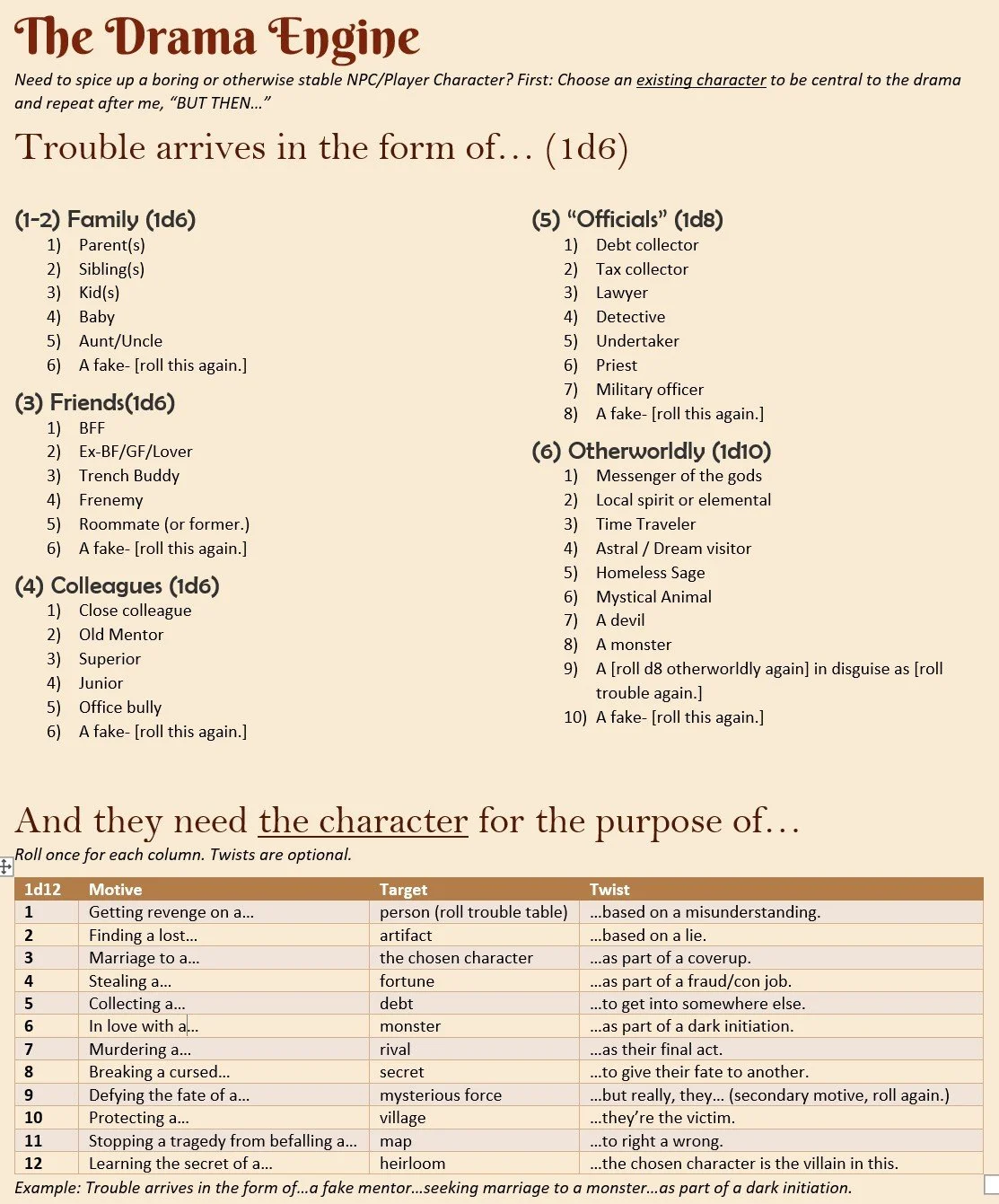 Today, I’m going to show you one of my favorite tables. I call it, The Drama Engine and it’s prefect for creating interesting problems and secrets that players can chase. It’s also good for causing trouble, hehehe.